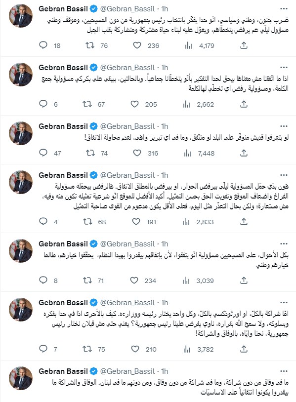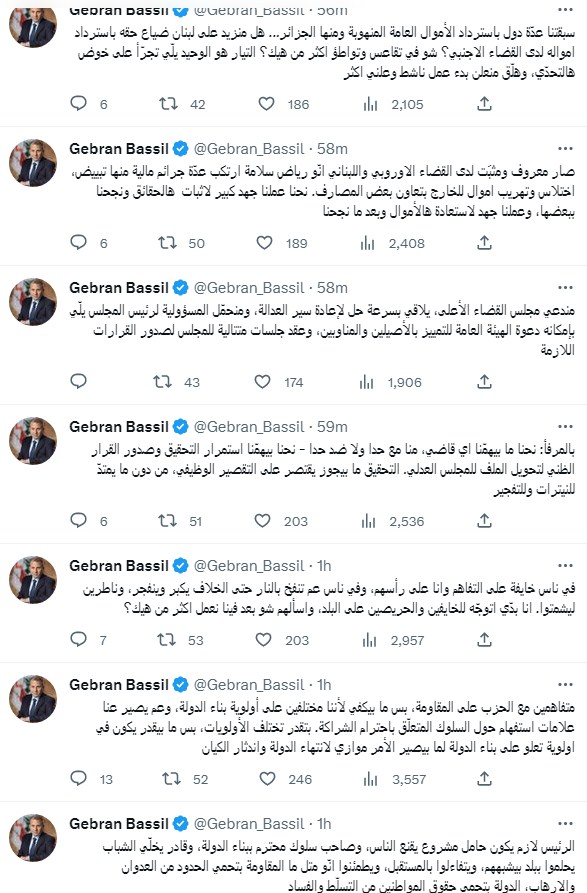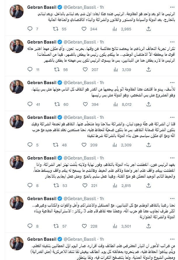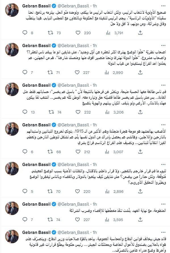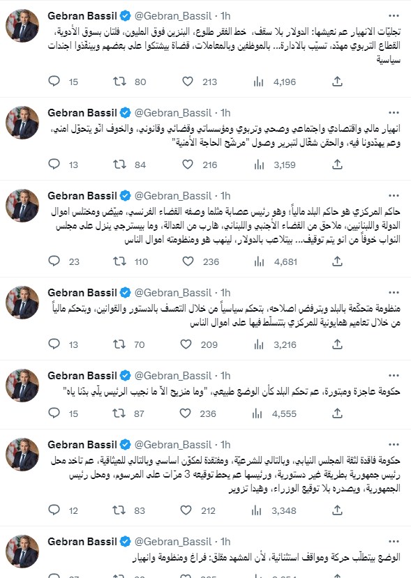 وكتب جبران باسيل تغريدة على تويتر عن أزمة لبنان فقال: "الوضع بيتطلّب حركة ومواقف استثنائية، لأن المشهد مقلق: فراغ ومنظومة وانهيار"