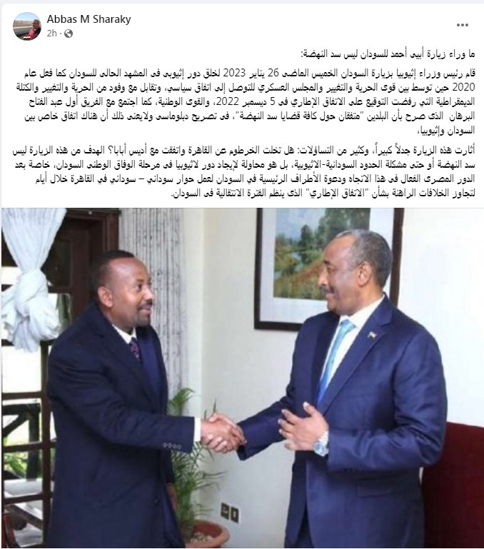 وقال الدكتور عباس شراقي عن زيارة آبي أحمد للسودان إن "ما وراء زيارة أبيى أحمد للسودان ليس سد النهضة: قام رئيس وزراء إثيوبيا بزيارة السودان الخميس الماضى 26 يناير 2023 لخلق دور إثيوبى فى المشهد الحالى للسودان كما فعل عام 2020 حين توسط بين قوى الحرية والتغيير والمجلس العسكري للتوصل إلى اتفاق سياسي"