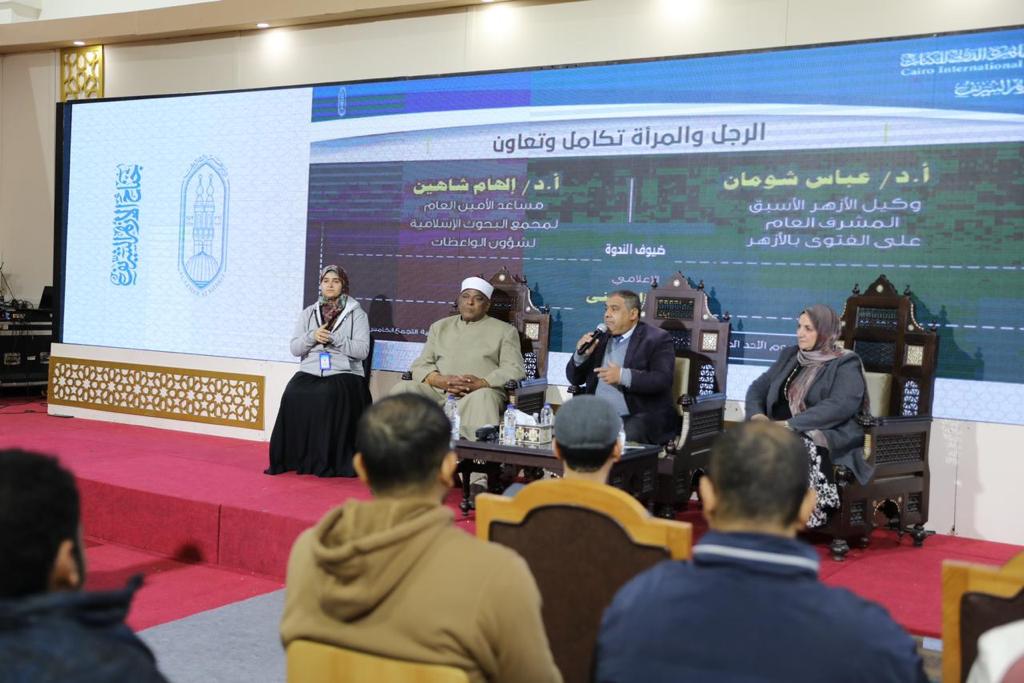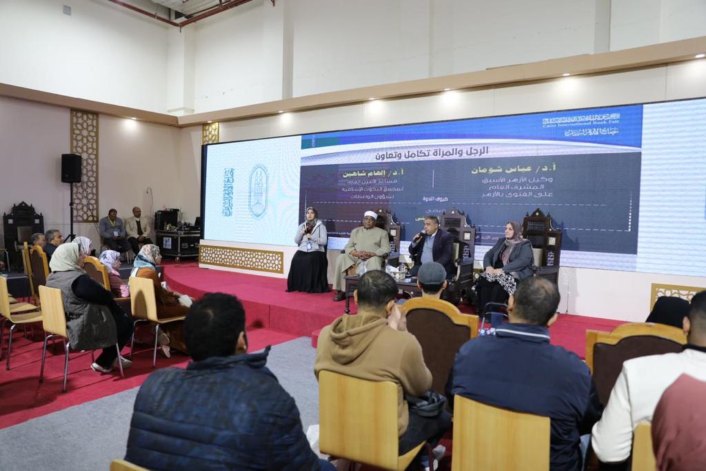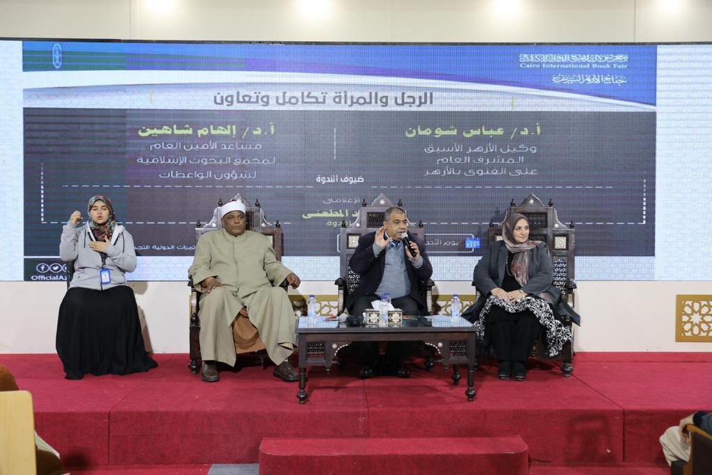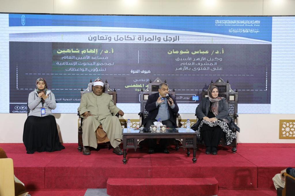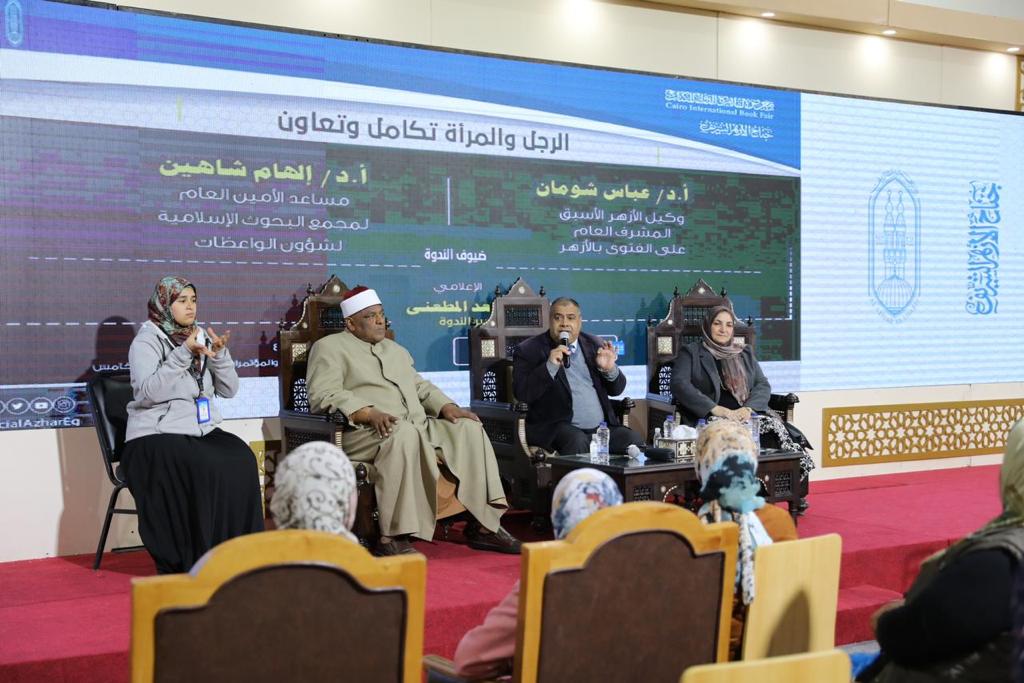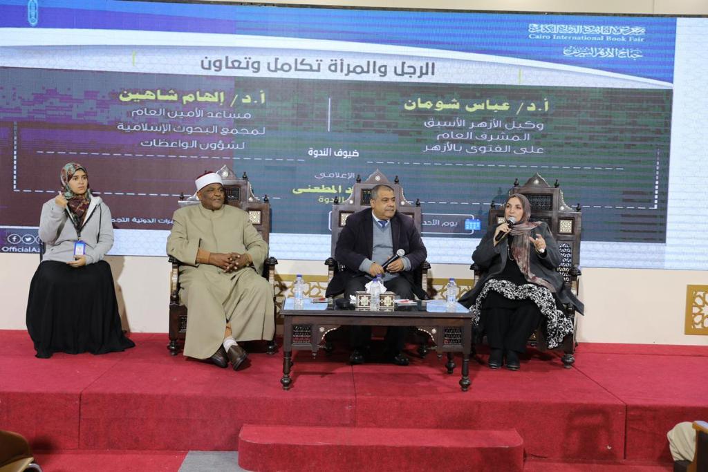 نظم جناح الأزهر الشريف بمعرض القاهرة الدولي للكتاب في نسخته (٥٤)، اليوم الأحد، ندوة تثقيفية حول طبيعة العلاقة بين الرجل والمرأة بعنوان: " الرجل والمرأة تكامل وتعاون "، ناقش فيها الدكتور عباس شومان، وكيل الأزهر الأسبق، والدكتورة إلهام شاهين، مساعد الأمين العام لمجمع البحوث الإسلامية لشؤون الواعظات، وأدار الندوة الاذاعي القدير سعد المطعني.