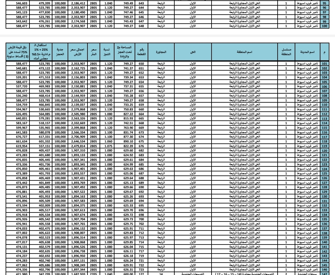 وتطرح أراضي في مدينة ناصر غرب أسيوط الحي الأول المجاورة الرابعة وجاهزة للتسليم وسعر المتر 2805 جنيه أما عن النسبة البنائية %50: الارتفاع أرضى + 3 أدوار متكررة والردود 3م امامي، و3م من الجانبين، ٤م خلفي.