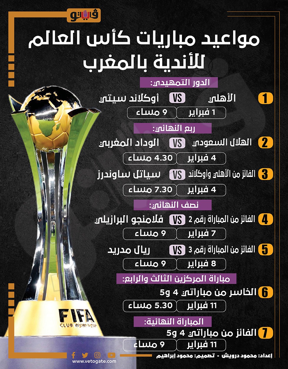 يستعد النادي الأهلي للمشاركة في كأس العالم للأندية بالمغرب خلال الفترة من 1 فبراير حتى 11 فبراير المقبل، وحدد الاتحاد الدولي لكرة القدم “ فيفا” مواعيد مباريات كأس العالم للأندية بمشاركة النادى الأهلي وصيف دوري أبطال أفريقيا النسخة الماضية.