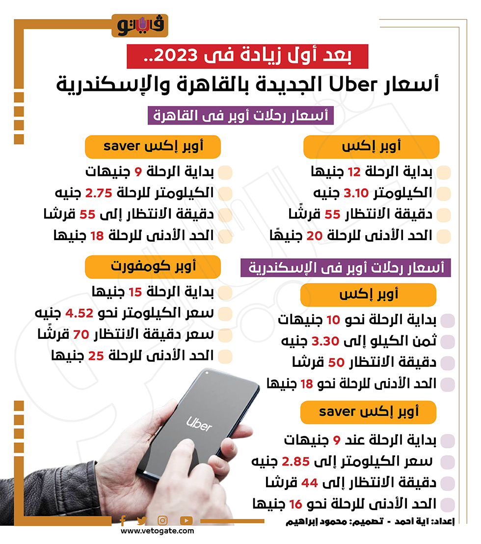 بعد أول زيادة فى 2023.. أسعار Uber الجديدة بالقاهرة والإسكندرية (إنفوجراف) الإثنين 30/يناير/2023 - 07:54 م 1/30/2023 7:54:04 PM أسعار uber الجديدة، فيتو آية أحمد شارك طباعة 18 حجم الخط شارك طباعة