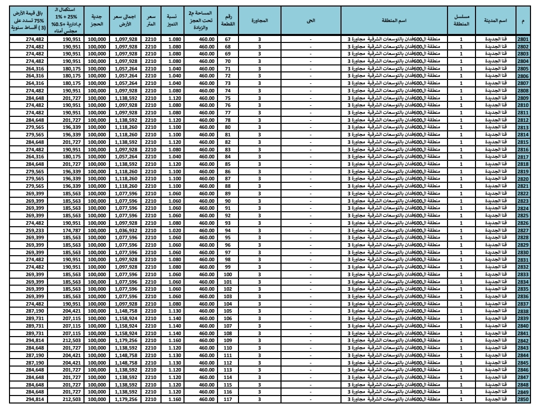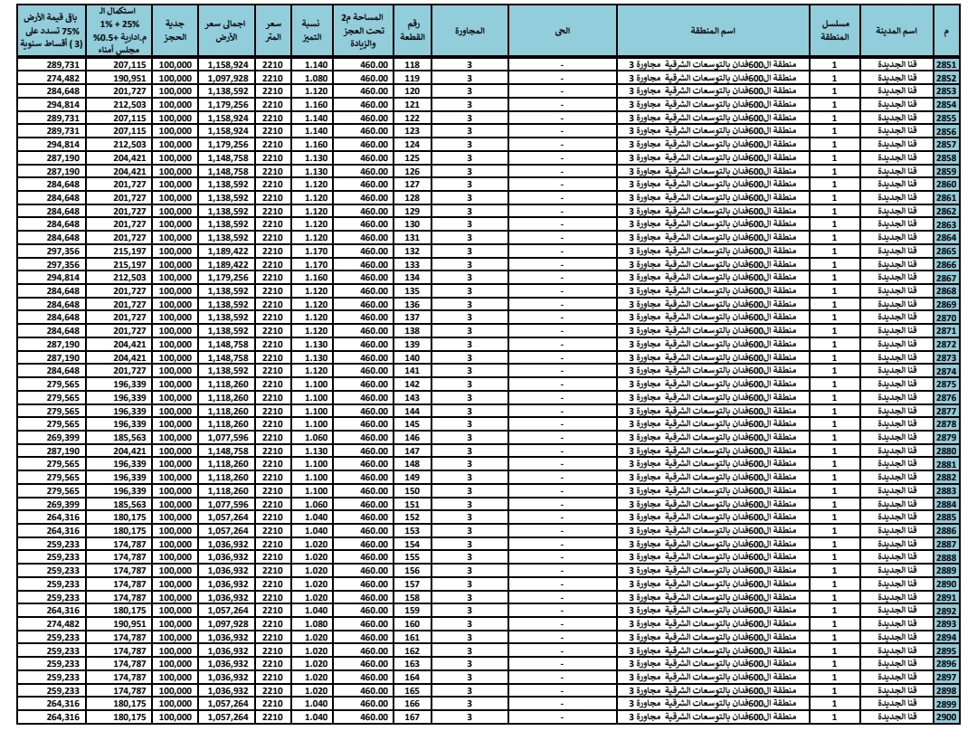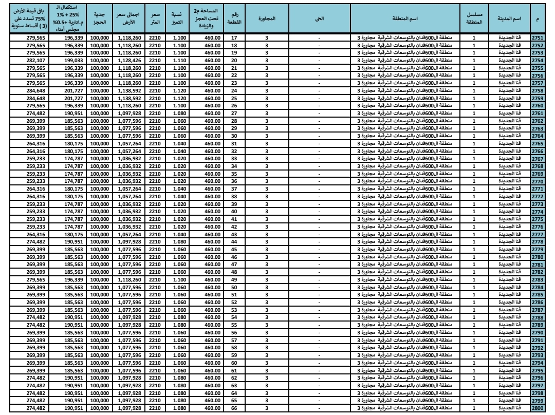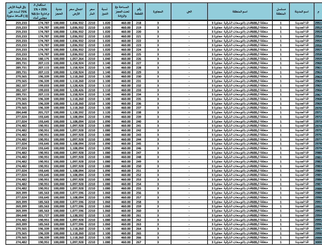وتم طرح أراضي بمدينة قنا الجديدة بمنطقة 600 فدان بالتوسعات الشرقية - مجاورة (3)ومنطقة 600 فدان التوسعات الشرقية - مجاورة (4) أما عن النسبة البنائية %50 بارتفاع أرضي + 3 متكرر ؛ 3م أمامی وجانبي ؛ 4م خلفي وسعر المتر 2210 جنيهات وتاريخ التسليم 2023-12-31.
