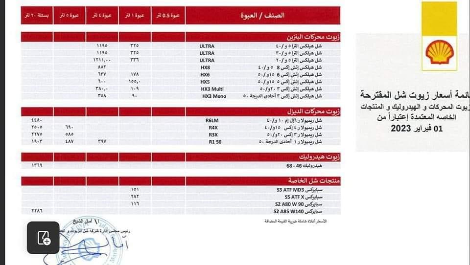كما تشمل الأسعار زيوت محركات الديزل في أربعة أنواع مختلفة بعبوات 4 أو 5 أو 20 لتر. وهناك كذلك زيوت الهيدروليك بنوع واحد ومنتجات شل الخاصة التي تضمنت 4 أنواع بعبوات 1 لتر أو 20 لتر.