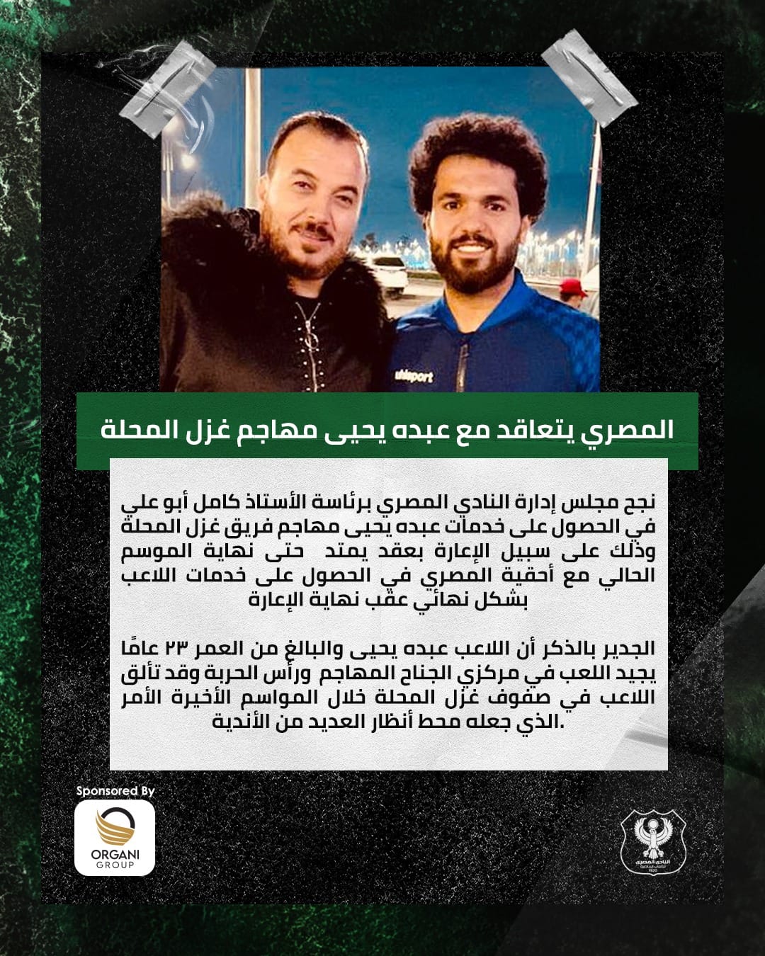 أعلن مسئولو النادي المصري برئاسة كامل أبو علي صفقة ضم عبده يحيى، مهاجم فريق غزل المحلة، خلال فترة الانتقالات الشتوية الحالية تدعيما لصفوف الفريق البورسعيدي.