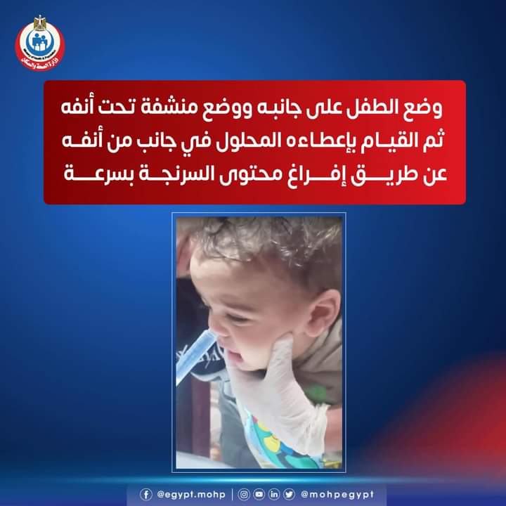 ٣-وضع للطفل على جانبه ووضع منشفه تحت الأنف ثم القيام باعطائه محلول في جانب انفه عن طريق إفراغ محتوي السرنجة بسرعة