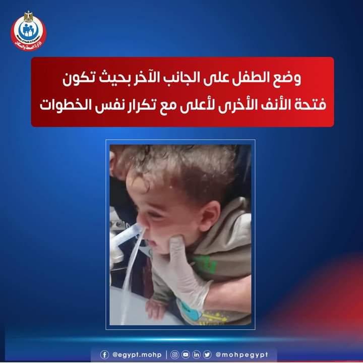 ٤-وضع الطفل علي الجانب الآخر بحيث تكون فتحة الأنف الأخري لأعلى مع تكرار نفس الخطوات.
