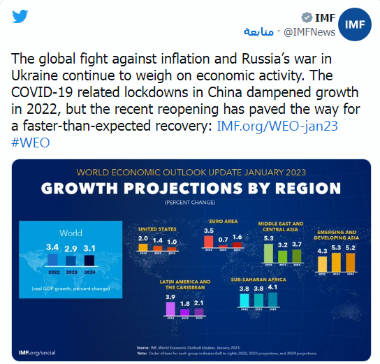 وتمثل تنبؤات عام 2023 ارتفاعا بمقدار 0,2 نقطة مئوية عما كان متوقعا في عدد أكتوبر 2022 من تقرير "آفاق الاقتصاد العالمي" وإن كانت أقل من المتوسط التاريخي البالغ 3,8 في المئة (من 2000 إلى 2019).