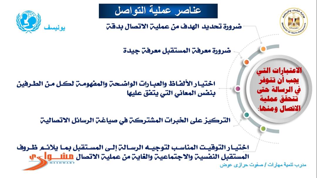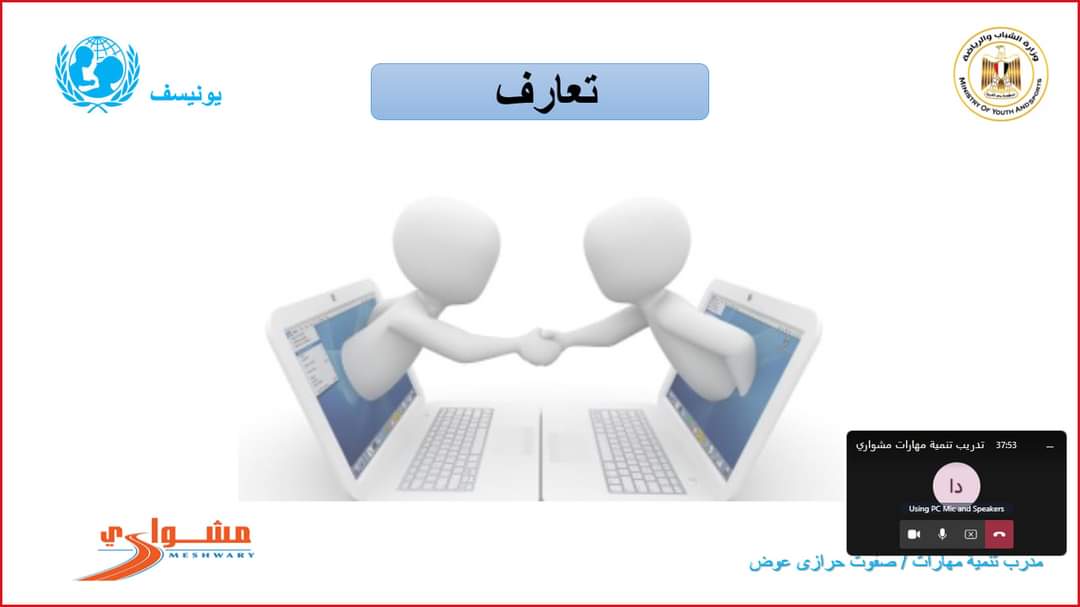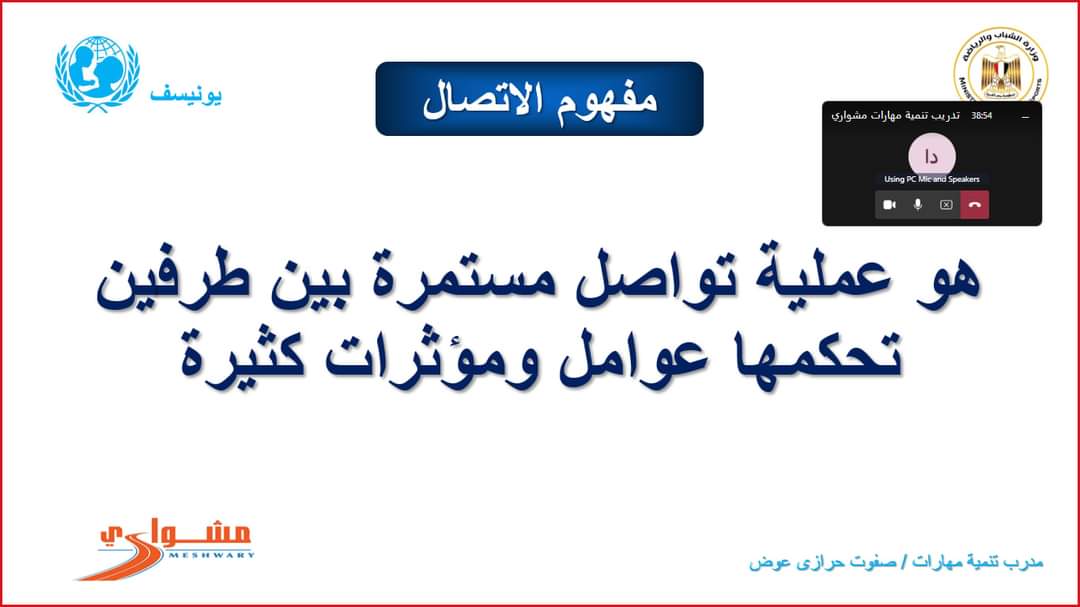 حيث تقدم إدارة التدريب ومشروعات الشباب تدريبات (المشورة والتوجيه المهني - تنمية المهارات الحياتية وريادة الاعمال - تنمية مهارات سفراء مشواري) تدريب بالأمس الاثنين الموافق ٣٠ يناير ٢٠٢٣م تدريب مشواري اونلاين تنميه مهارات قام بالتدريب مدرب صفوت حرازي.