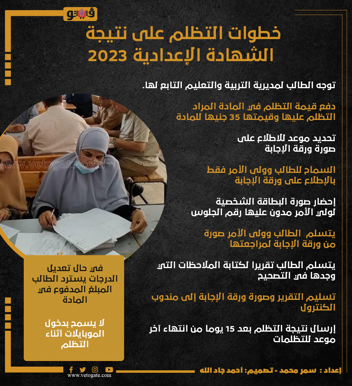 خطوات التظلم على نتيجة الشهادة الإعدادية 2023 (إنفوجراف) الأربعاء 01/فبراير/2023 - 01:17 م 2/1/2023 1:17:08 PM تظلمات الشهادة الإعدادية سمر محمد شارك طباعة 18 حجم الخط شارك طباعة نتيجة الشهادة الإعدادية 2023 الشهادة الاعدادية الشهادة الإعدادية 2023 تظلمات الشهادة الإعدادية