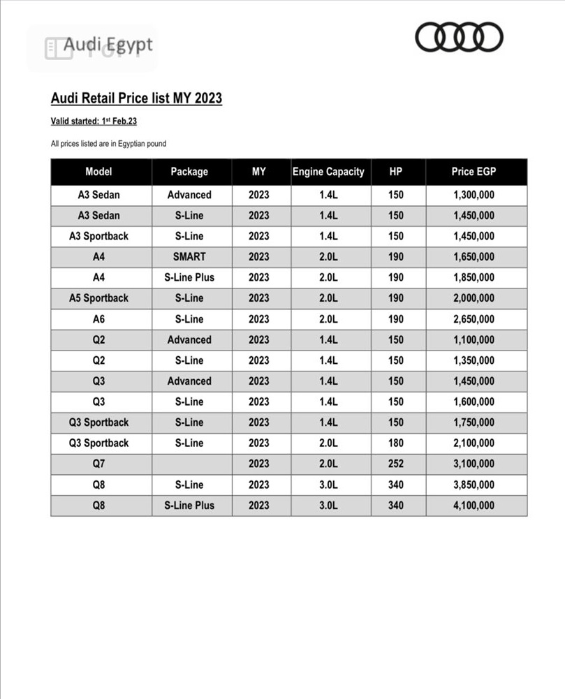 سيارات أودي أعلن الوكيل المحلي للعلامة التجارية أودي، أرتفاع أسعار سيارات أودي بقيمة تتراوح مابين 50 حتي 350 ألف جنيه، متاثرة بزيادة سعر الدولار داخل السوق المصري.