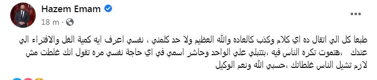 نشر حازم إمام نجم الزمالك السابق وعضو مجلس إدارة اتحاد الكرة رسالة غامضة عبر حسابه الشخصي على موقع التواصل الاجتماعي "فيسبوك".