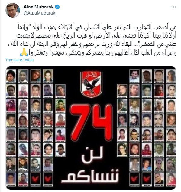 وتابع علاء مبارك رسالته المؤلمة في ذكري شهداء الأهلي مقدمًا العزاء لأهاليهم فقال: "البقاء لله وربنا يرحمهم ويغفر لهم وفي الجنة إن شاء الله، وعزاء من القلب لكل أهاليهم ربنا يصبركم ويثبتكم، تعيشوا وتفتكروا".
