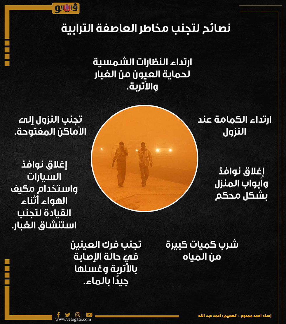 نصائح لتجنب مخاطر العاصفة الترابية (انفوجراف) الأربعاء 01/فبراير/2023 - 07:39 م 2/1/2023 7:39:36 PM نصائح لتجنب العاصفة الترابية أحمد ممدوح شارك طباعة 18 حجم الخط شارك طباعة