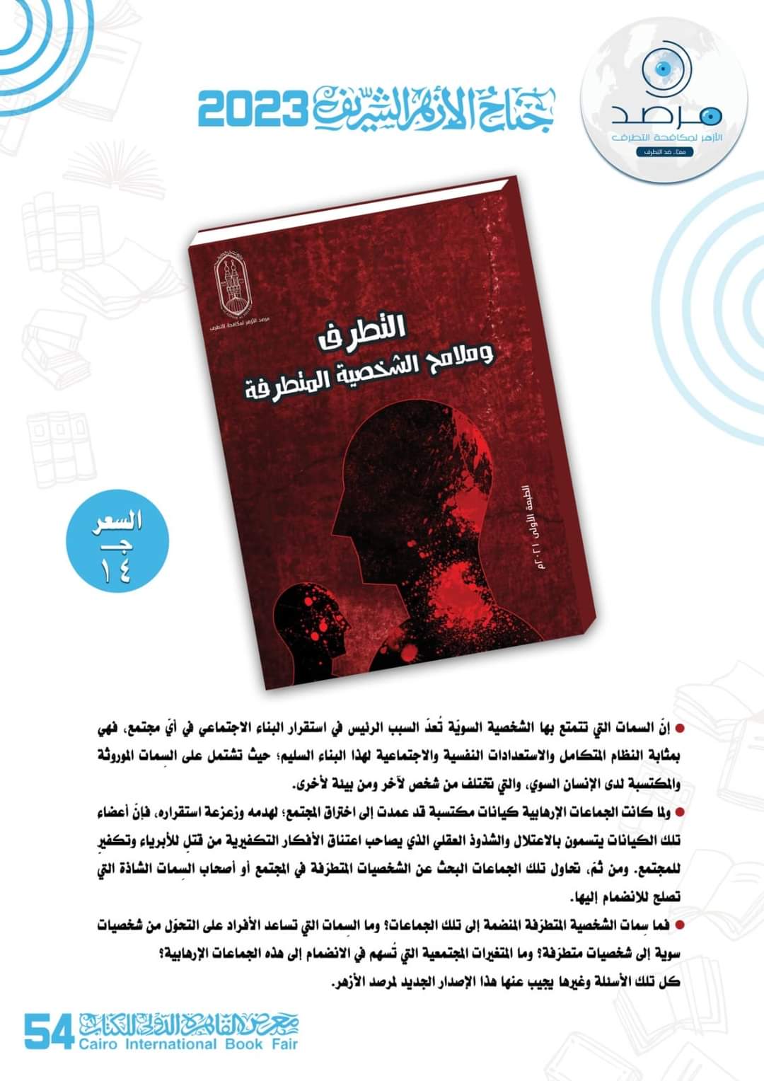 يعرض جناح الأزهر بمعرض القاهرة الدولي للكتاب، كتاب تحت عنوان "التطرف وملامح الشخصية المتطرفة" والذي أخرجه مرصد الأزهر الشريف.