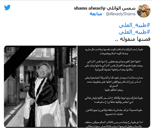 في حين أشارت قناة "الشرقية" عبر حسابها في "تويتر" إلى أن البلوجر المقتولة هي طيبة العلي.