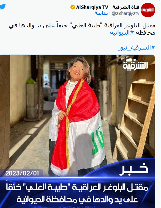 ونقلت قناة "السومرية" العراقية عن مصدر أمني، تأكيده وقوع جريمة قتل راح ضحيتها "بلوجر" شابة على يد ذويها دون الكشف عن هويتها.