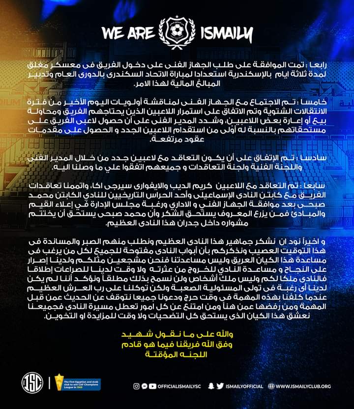 نادي الإسماعيلي، أصدرت اللجنة المؤقتة لإدارة النادي الإسماعيلي توضيحًا للعديد من الحقائق الخاصة بالصفقات التي تعاقد معها النادي.