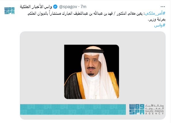 أعلنت الملكة العربية السعودية، عبر وكالة الأنباء السعودية الرسمية "واس"، أن هناك أمرا ملكيا صدر بتعيين الدكتور فهد بن عبد الله بن عبداللطيف المبارك مستشارًا بالديوان الملكي بمرتبة وزير.
