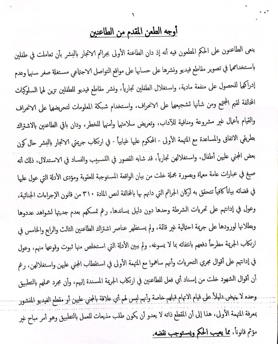 جاء في مذكرة أسباب الطعن بالنقض المقدمة من المحامي سامح أن الحكم قد صدر باطلا ومخالفا للقانون ومشوبا بعيوب الخطأ في القانون وتأويله مع الفساد في الاستدلال وانتفاء الجريمة وانعدامها وانهيار أركانها وعدم انطباق النصوص والتعريفات والشروط الخاصة بالجريمة وانتفاء الإخلال بالقيم وان ما قامت به الفتاتان لا يتجاوز ما يشاهد في القنوات الرسمية المصرية ولا يتعدى التراث الفني المصري بقيمه ومشاهده، ودفوعا عن البطلان لانتفاء علاقة المتهمة بالفيديوهات التي عرضت بالمحكمة وفق تقارير الفحص الفني وأن مايصح منها لاتشوبه شائبة فلا جريمة في الظهور مع اطفال في فيديوهات بريئة لاتحتمل هذه الاتهامات، وكذلك الإخلال بحق المتهمة في الدفاع وجائت الأسباب عديدة منها الإخلال الجسيم بحق الدفاع بمنع الفتاة من ابداء دفاعها أو الحديث رغم قيامها باستعطاف المحكمة حتى يتسنى لها الحديث ومحاولتها اثبات بعض الدفوع التي لم يذكرها محاميها وتم رفض سماعها بتعسف بما يبطل الحكم لأن حق المتهم في ابداء اقواله هو جوهر حق الدفاع وقد أكدت محكمة النقض في مبادئها أن الإخلال بحق الدفاع معناه حرمان المتهم من ابداء أقواله بكامل الحرية أو بإهمال الفصل في طلب صريح من طلبات التحقيق او في الدفوع الفرعية التي يبديها.