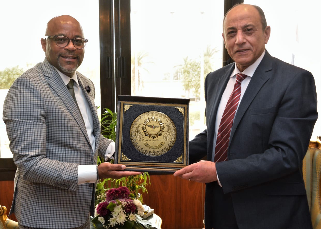وفي نهاية اللقاء أهدى الفريق محمد عباس درع وزارة الطيران للسيد مايكل هانكوك تقديرًا لجهوده فى تعزيز العلاقات فى مجال النقل الجوى.