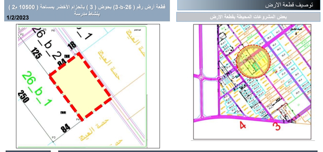 قطعة أرض رقم ( 3 – b - 26) بحوض ( 3 ) بالحزام الأخضر بمساحة ( 10500 م2 ) بنشاط مدرسة وسعرها التقديري 6090 جنيه مصري للمتر مربع.