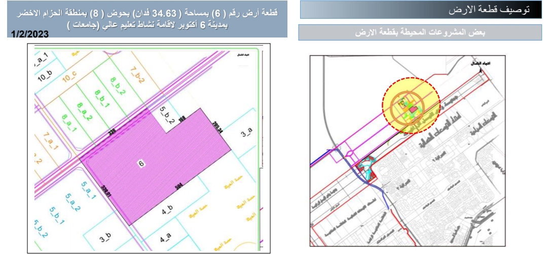 قطعة أرض رقم (6) بمساحة (34.63 فدان) بحوض (8) بمنطقة الحزام الاخضر بمدينة 6 أكتوبر لاقامة نشاط تعليم عالي (جامعات ) وسعرها التقديري 4185 جنيها مصري للمتر مربع.
