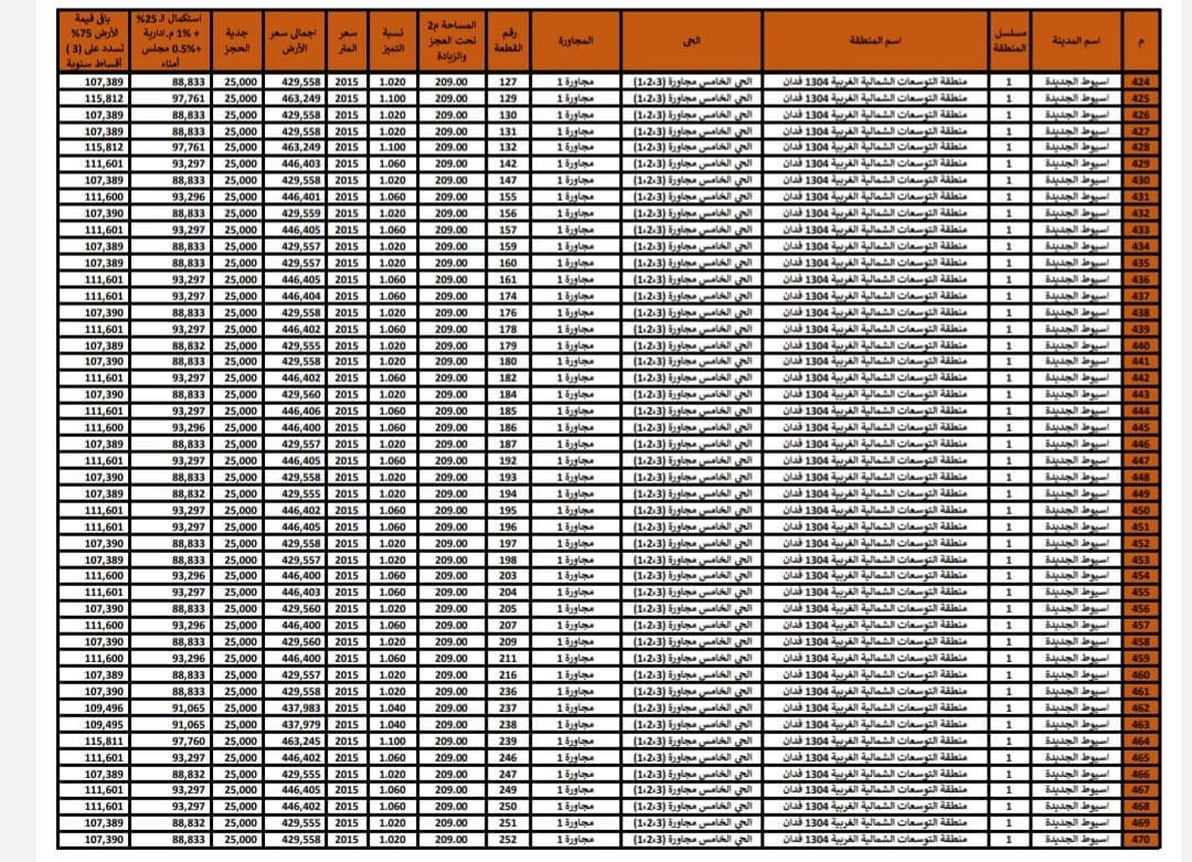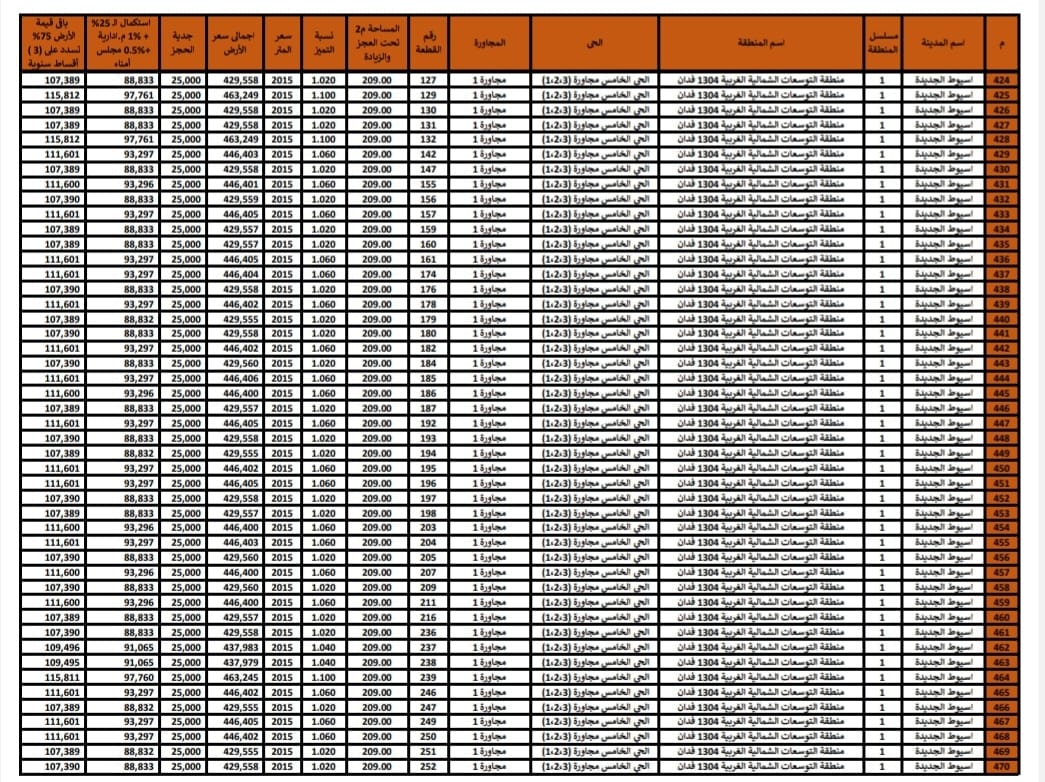 وعدد الأراضي418 قطعة أرض ومساحات تتراوح بين218-199 متر مربع وسعر المتر 2015 بالإضافة لمنطقة الـ 375 فدان - منطقة (3-1) بحي التوسعات الجنوبية الشرقية في أسيوط الجديدة وعدد الأراضي 255 قطع أرض وسعر المتر 2015 جنيها.