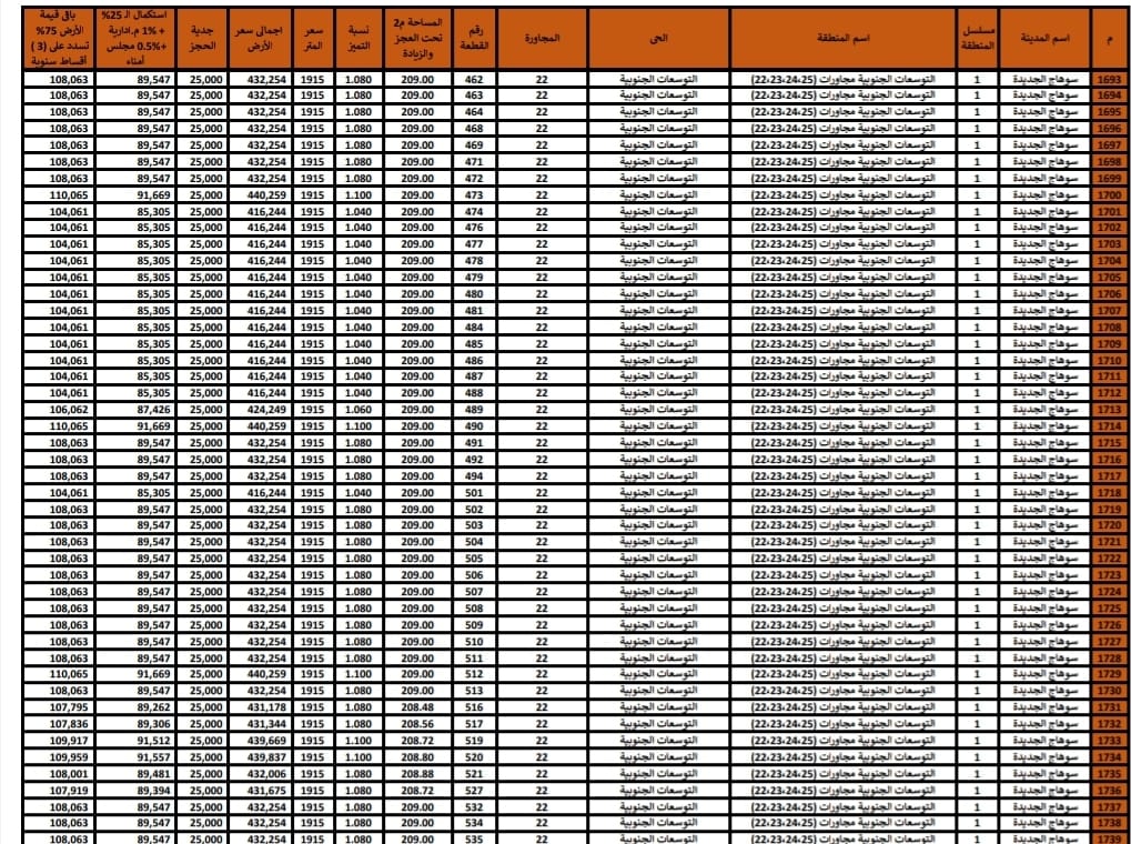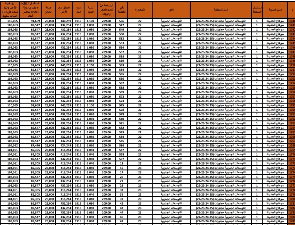 تم طرح أراضي بمنطقة مجاورة (25-24-23-22) بسوهاج الجديدة بمساحة 209 متر مربع وسعر المتر 1915 وأراضي بمساحة 276 متر مربع 2245جنيه ومنطقة مجاورة (49-48-47-46-45) سعر المتر يبدأ فيها 1915 إلى 2245