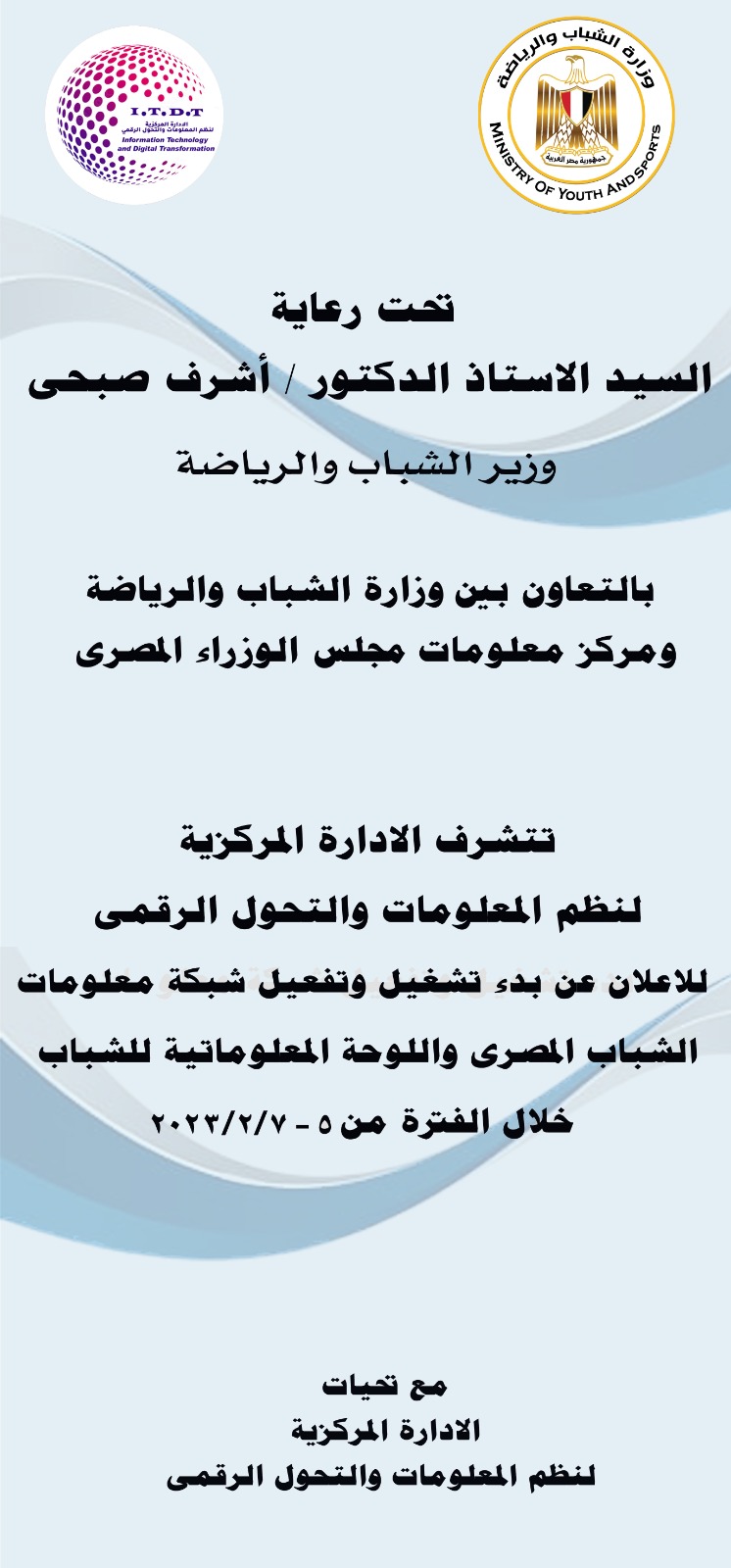 أعلنت وزارة الشباب والرياضة، بدء تشغيل وتفعيل شبكة معلومات الشباب المصري واللوحة المعلوماتية للشباب، في الفترة من 5-7 فبراير الجاري، بالتعاون مع مركز المعلومات ودعم اتخاذ القرار بمجلس الوزراء، وبرعاية وزير الشباب والرياضة من خلال الإدارة المركزية لنظم المعلومات والتحول الرقمي.