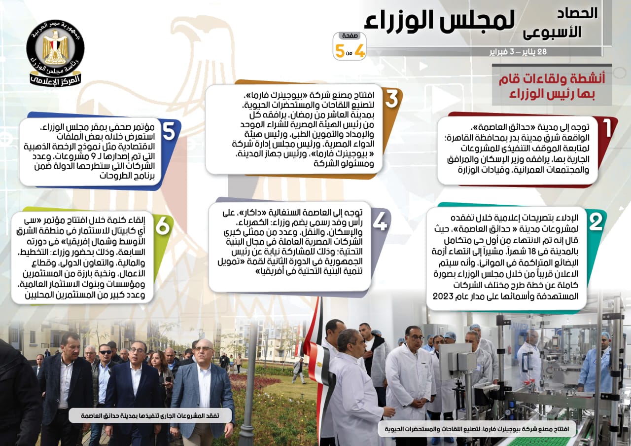 نشر المركز الإعلامي لمجلس الوزراء، تقريرًا شمل إنفوجرافات سلط من خلالها الضوء على الحصاد الأسبوعي لمجلس الوزراء، وذلك خلال الفترة من 28 يناير حتى 3 فبراير 2023، والذي تضمن الموافقة على عدد من القرارات، فضلًا عن الاجتماعات واللقاءات التي عقدها الدكتور مصطفى مدبولي، رئيس مجلس الوزراء، بالإضافة إلى ما قام به سيادته من أنشطة.