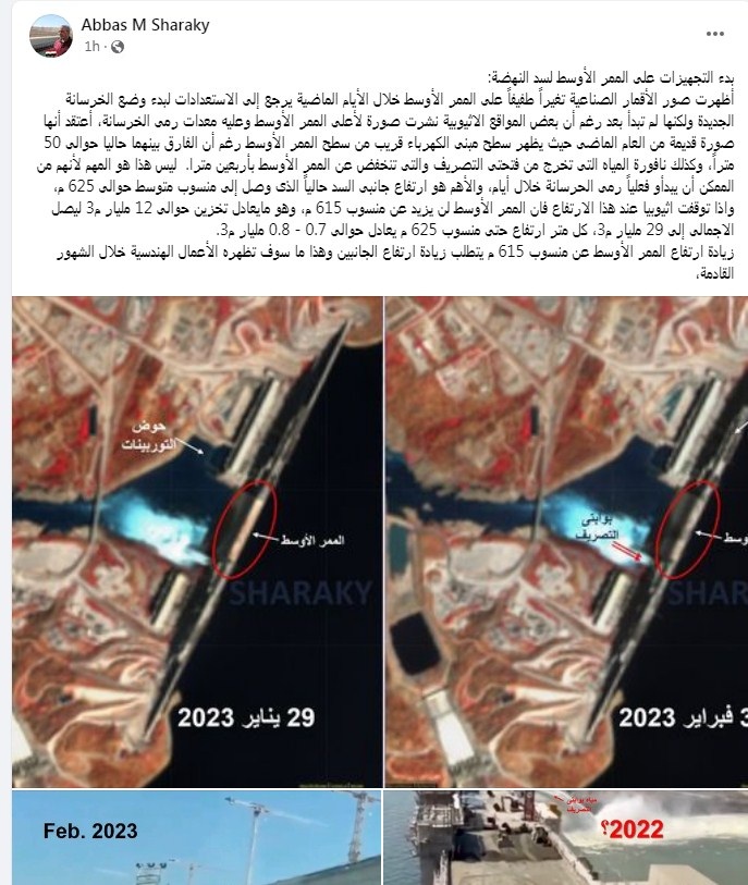 وعن صور المعدات التي نُشرت لأعلى الممر الأوسط في سد النهضة قال عباس شراقي: "أعتقد أنها صورة قديمة من العام الماضى حيث يظهر سطح مبنى الكهرباء قريب من سطح الممر الأوسط رغم أن الفارق بينهما حاليا حوالى 50 مترًا، وكذلك نافورة المياه التى تخرج من فتحتى التصريف والتى تنخفض عن الممر الأوسط بأربعين مترا."