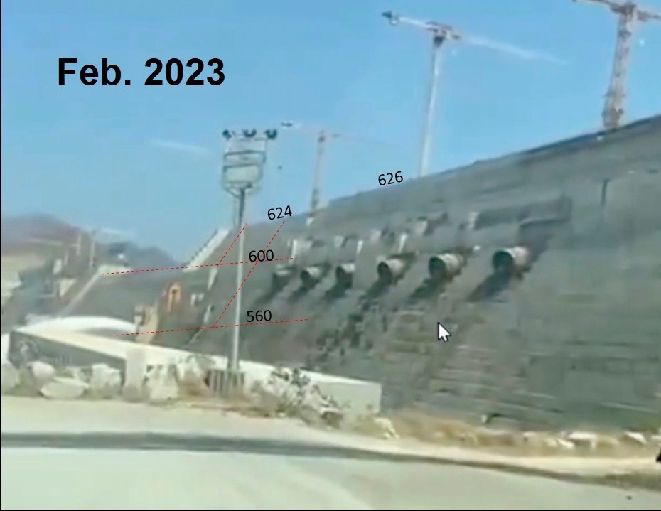 وتابع الدكتور عباس شراقي قائلًا: "ليس هذا هو المهم لأنهم من الممكن أن يبدأو فعليًا رمى الخرسانة خلال أيام، والأهم هو ارتفاع جانبى السد حاليًا، الذى وصل إلى منسوب متوسط حوالى 625 متر، واذا توقفت اثيوبيا عند هذا الارتفاع فان الممر الأوسط لن يزيد عن منسوب 615 متر، وهو مايعادل تخزين حوالى 12 مليار متر مكعب ليصل الاجمالى إلى 29 مليار م3، كل متر ارتفاع حتى منسوب 625 م يعادل حوالى 0.7 - 0.8 مليار متر مكعب."