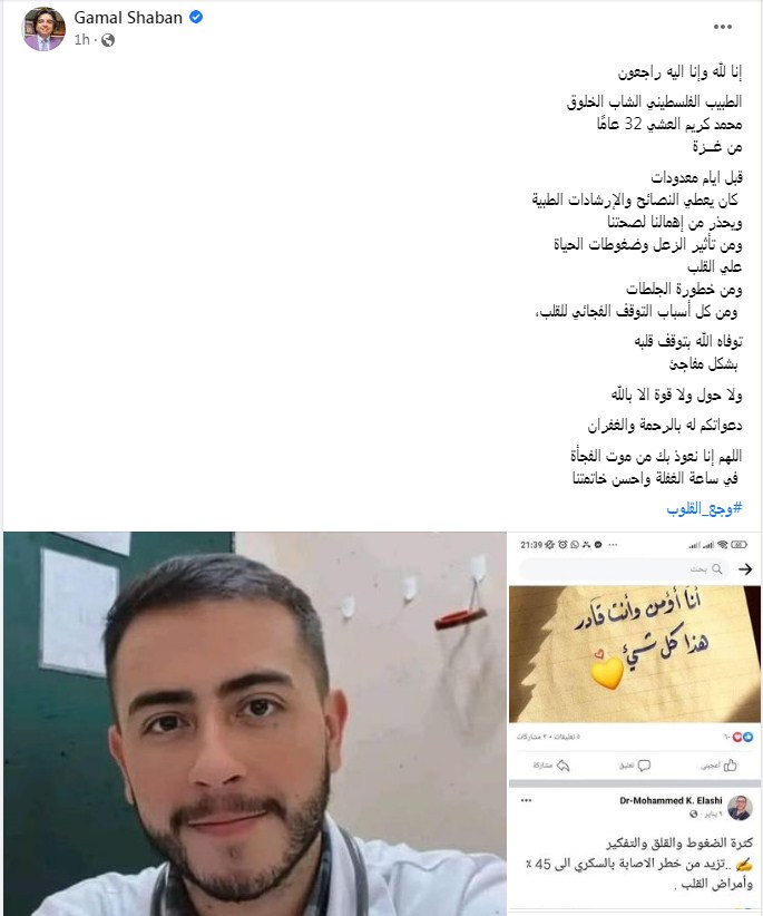 وكتب جمال شعبان تدوينة على الفيس بوك عن موت الفجأه ووفاة الطبيب الفلسطيني الشاب فقال: "إنا لله وإنا اليه راجعون، الطبيب الفلسطيني الشاب الخلوق محمد كريم العشي 32 عامًا من غــزة"