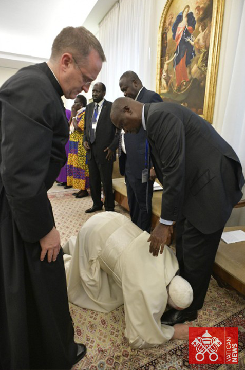 وتزامنا مع زيارة بابا الفاتيكان لجنوب السودان، نشرت الصفحة الرسمية لأخبار الفاتيكان صورا تعود لعام 2019، للبابا فرنسيس، وهو يقبل أقدام السياسيين في جنوب السودان لحثهم على القبول بالسلام، وعدم الاحتراب والاقتتال الداخلي.