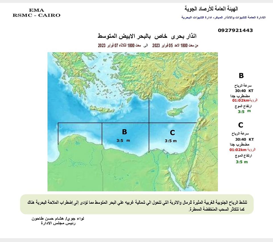 حذرت الأرصاد الجوية من حالة الطقس بداية من غد الأحد وحتى يوم الخميس المقبل لخطورتها على الملاحة البحرية وأعلنت أنه اعتبارا من مساء غد الأحد ٥ فبراير ٢٠٢٣ حتى مساء الثلاثاء ٧ فبراير ٢٠٢٣ تشهد البلاد اضطرابا فى حركة الملاحة البحرية على مسطح البحر المتوسط.