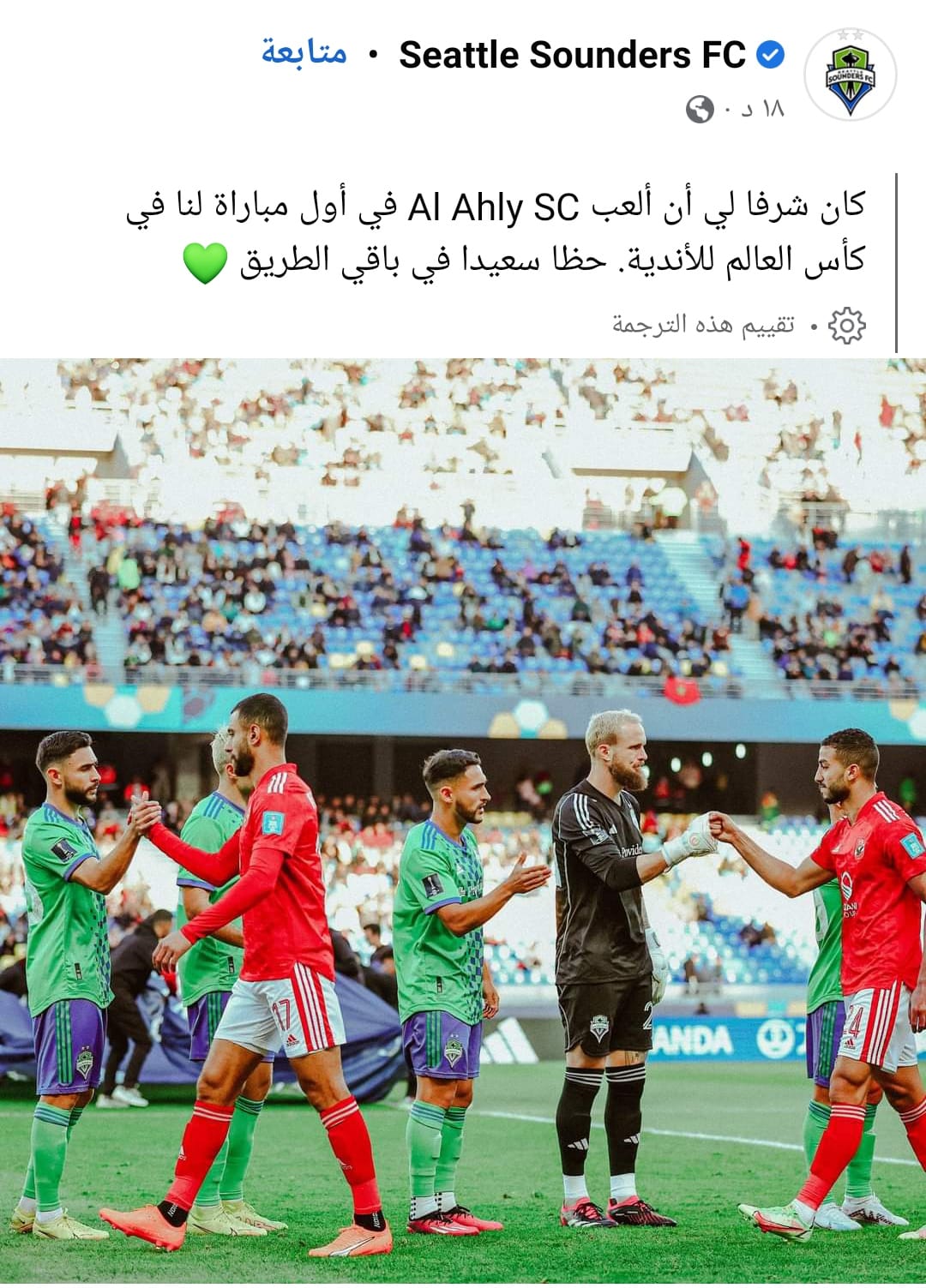 كأس العالم للأندية، وجه نادي سياتل الأمريكي رسالة لنظيره الأهلي بعد فوز القلعة الحمراء بهدف نظيف وتأهله لمواجهة ريال مدريد في نصف نهائي مونديال الأندية.