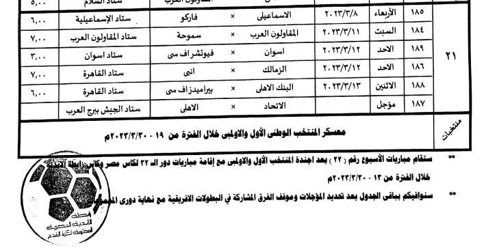 وأكدت رابطة الاندية أن مباريات الجولة ٢٢ ستقام عقب معسكر المنتخبين الأول والأولمبي خلال الفترة من ١٩ وحتى ٣٠ مارس المقبل، مع التأكيد على إقامة مباريات دور الـ ٣٢ من بطولة كأس مصر وكذلك لقاءات النسخة الجديدة من كأس الرابطة خلال الفترة من ١٣ وحتى ٣٠ مارس.
