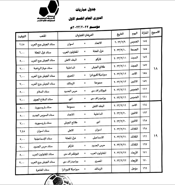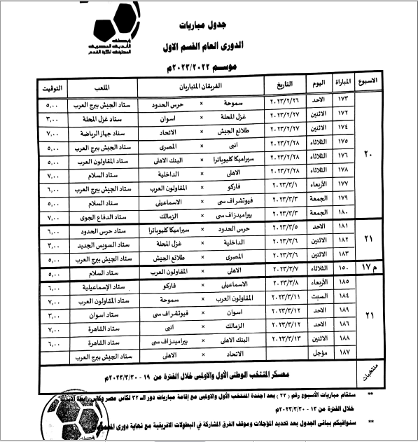 وأكدت رابطة الاندية أن مباريات الجولة ٢٢ ستقام عقب معسكر المنتخبين الأول والأولمبي خلال الفترة من ١٩ وحتى ٣٠ مارس المقبل، مع التأكيد على إقامة مباريات دور الـ ٣٢ من بطولة كأس مصر وكذلك لقاءات النسخة الجديدة من كأس الرابطة خلال الفترة من ١٣ وحتى ٣٠ مارس.