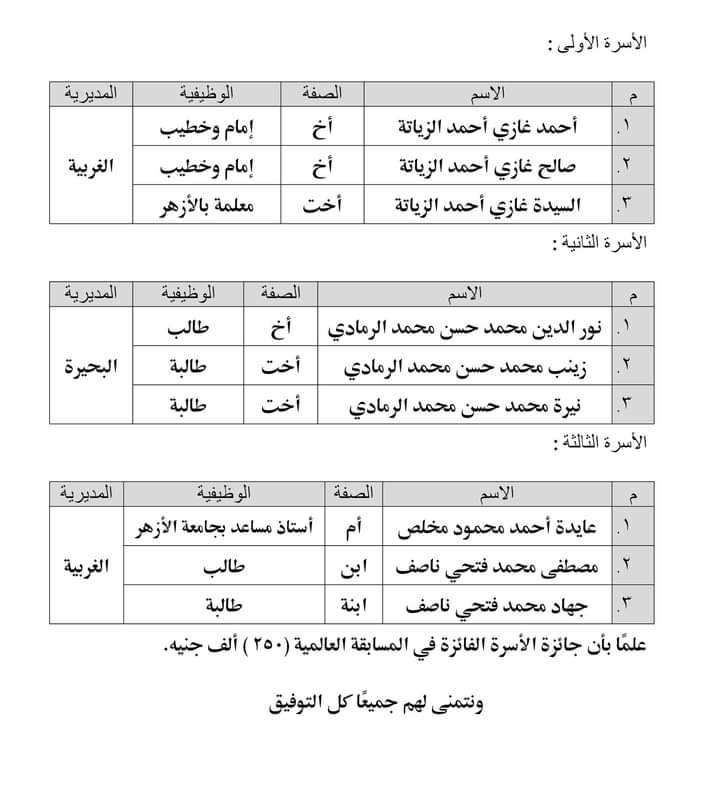 الفرع الثاني: الأسرة القرآنية، حفظ القرآن الكريم كاملًا مع فهم معانيه ومقاصده العامة، وعدد المتسابقين 3 أسر، بجائزة 300 ألف جنيه للأسرة الفائزة.