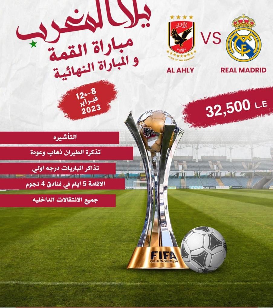 وأعلنت إحدى شركات السياحة تنظيم رحلة للجماهير المصرية، لمشاهدة مباراة الأهلي وريال مدريد بجانب المباراة النهائية لبطولة كأس العالم للأندية، مقابل 32 ألفا و500 جنيهـ تتضمن الحصول على التأشيرة بجانب تذاكر الطيران ذهاب وعودة، وتذاكر لحضور المباراتين في الدرجة الأولى، والإقامة لمدة 5 أيام في فنادق 4 نجوم، بالإضافة للانتقالات داخل المغرب.