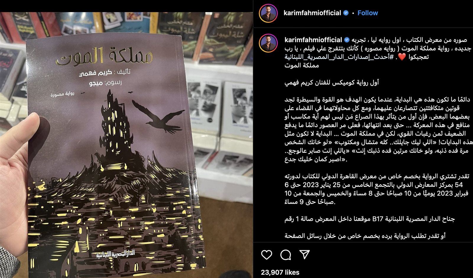 ونشر كريم فهمي، عبر حسابه الرسمي على موقع تبادل الصور إنستجرام صورة وهو يحمل الرواية وأرفق تعليق طويل قائلًا: "صورة من معرض الكتاب، أول روايه ليا، تجربه جديده، رواية مملكة الموت ( روايه مصوره ) كأنك بتتفرج علي فيلم، يا رب تعجبكوا ❤️.