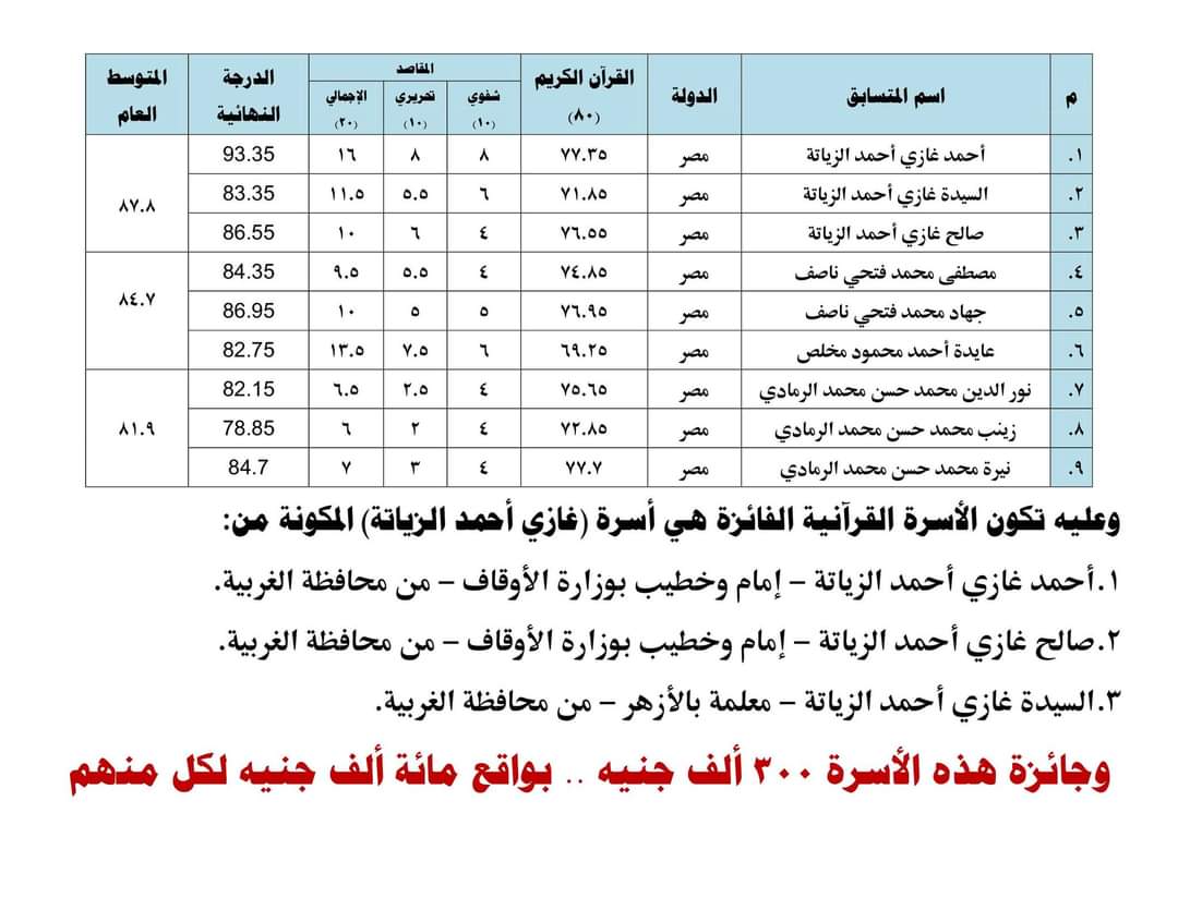 وأسفرت النتيجة عن فوز أسرة غازي أحمد الزياته، وتتكون من أحمد غازي أحمد الزياتة، وصالح غازي أحمد الزياتة، والسبدة غازي أحمد الزياتة، بجائزة الأسرة القرآنية بقيمة 300 ألف جنيه.