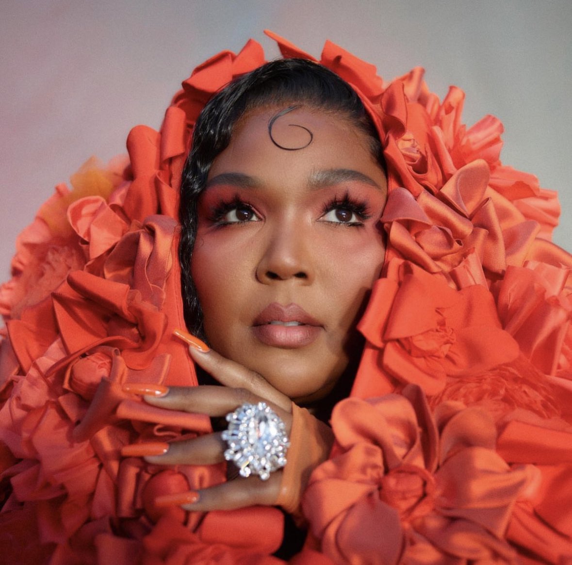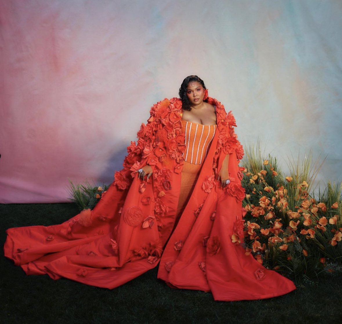 الجرامي، استمرار لإطلالتها الغريبة، ظهرت المغنية السمراء ليزو، خلال حضورها حفل توزيع الجوائز العالمي، بفستان برتقالي اللون، ضخم، مليء بالورود، واستكملت إطلالتها بخواتم ماسية، عملاقة.