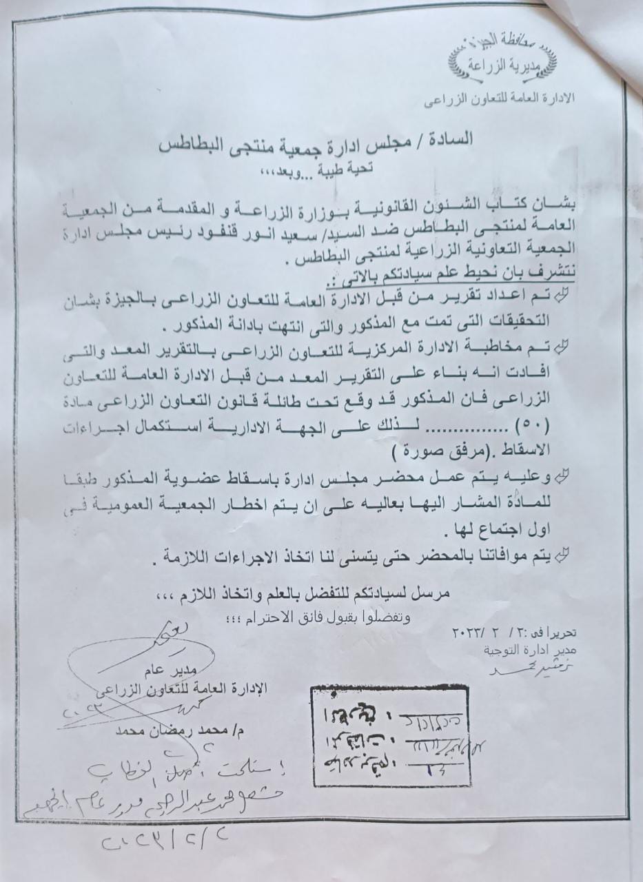 كما خاطبت الإدارة المركزية، فرع الإدارة بمديرية الزراعة بالجيزة لاتخاذ ما يلزم أيضا من إسقاط عضوية "أبو شميلة" بصفته رئيسا للجمعية التعاونية للبطاطس في الجيزة.