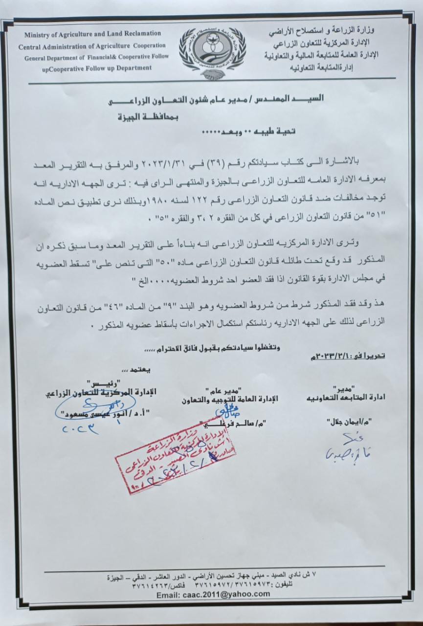 وانتهى الخطاب إلى توجيه الإدارة المركزية للتعاون الزراعي بضرورة اتخاذ الإجراءات القانونية اللازمة لاسقاط عضوية سعيد أنور قنفود أبو شميلة من مجلس إدارة الجمعية.