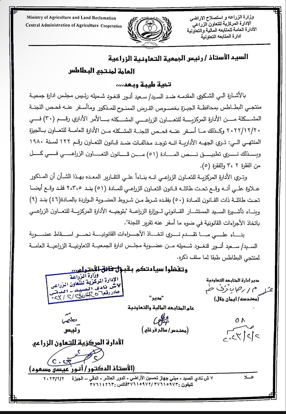 خاطبت الإدارة المركزية للتعاون الزراعي، بوزارة الزراعة واستصلاح الأراضي، الجمعية العامة لمنتجي البطاطس، وجمعية الجيزة لاتخاذ الإجراءات القانونية اللازمة لإسقاط عضوية سعيد أنور قنفود أبو شميلة عضو مجلس إدارة الجمعية بعد المخالفات التي وقع فيها تجاه قانون التعاون الزراعي.