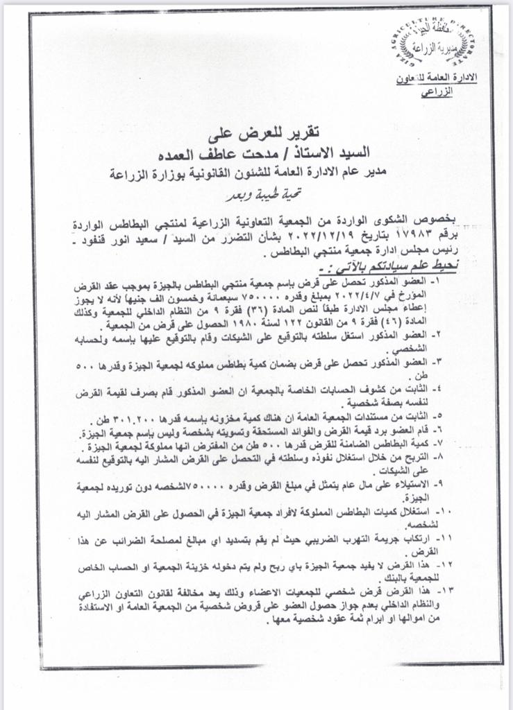 وثبت من اقوالهم مخالفات سعيد ابو شميله رئيس جمعية البطاطس بالجيزة، والواردة في تقرير الإدارة المركزية للتعاون، وطالبت بتطبيق المادة الخاصة بإسقاط العضوية عليه.
