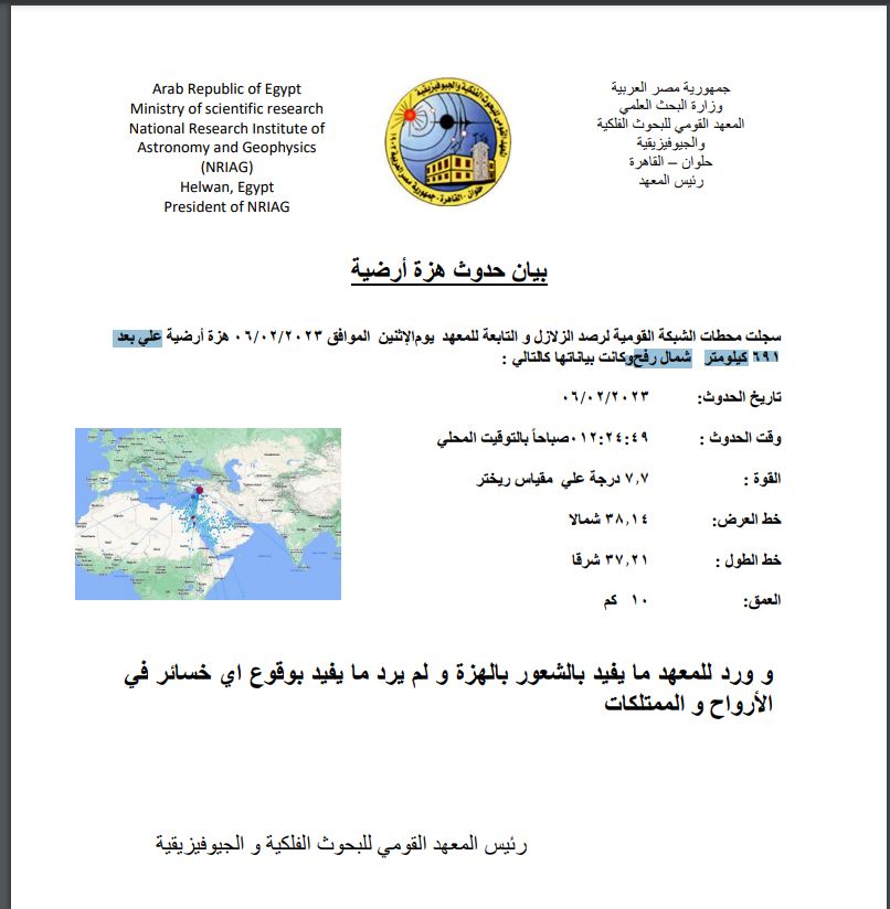 أعلن رئيس المعهد القومي للبحوث الفلكية والجيوفيزيقية، جاد القاضي، عن حدوث زلزال آخر منذ قليل بعد زلزال تركيا، بعد أن سجلت محطات الشبكة القومية للزلازل والتابعة للمعهد، سجلت هزة أرضية بقوة 7.7 ريختر، علي بعد 691 كيلومتر شمال رفح.