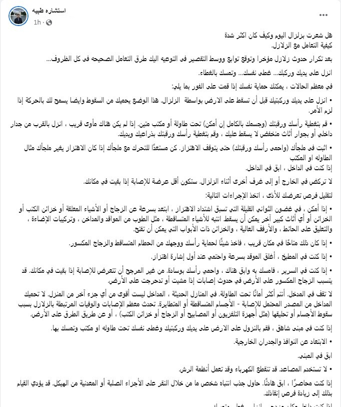 وعن كيفية التعامل مع الزلازل، وخاصة بعد زلزال اليوم، قدم الدكتور وليد شوقي نصائح للطرق الصحيحة للتعامل مع الزلازل، وخاصة بعد تكرار حدوثها، مؤخرا، وتوقع حدوث توابع لها فقال: "انزل على يديك وركبك... غطِّ نفسك... وتمسك بالغطاء."